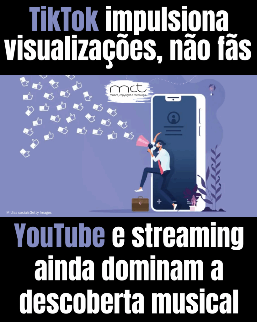 O mais recente relatório da MIDiA Research aponta que, embora o TikTok seja um fenômeno de visibilidade, sua eficácia em transformar virais em streams ou fãs de longo prazo é limitada. A pesquisa global, que ouviu 10 mil participantes, revelou que o YouTube segue como a principal plataforma de descoberta musical (52%), seguido pelos serviços de streaming (40%) e só depois pelo TikTok (37%). Apenas 12% dos consumidores se enquadram na faixa de 16 a 24 anos que descobrem música majoritariamente pelo TikTok, justamente o grupo mais visado pela indústria, mas que representa uma parcela pequena do público total.